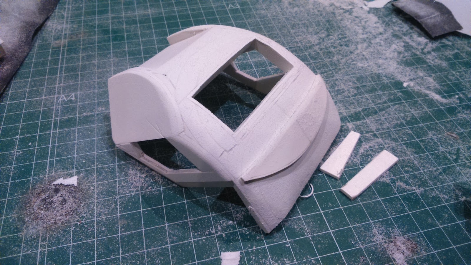 Se empieza a fabricar el testero,para hacer la forma redondeada del testero se necesita tallarlo a partir de una base hecha de forma basta tomando casi la forma del testero para empezar a tallar con couter y después de tallar ,lijarlo hasta tener reproducido el testero perfecto y que conlleva mucho trabajo tal y como se ven en las siguientes fotos